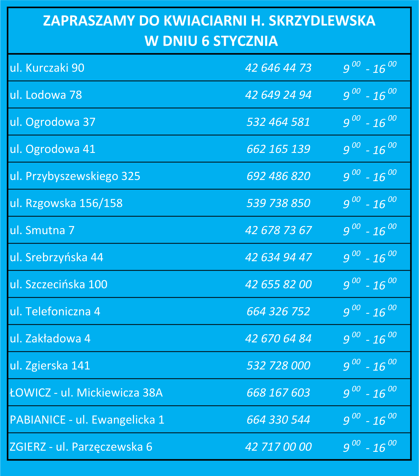 Serdecznie zapraszamy do kwiaciarni H. Skrzydlewska 6 stycznia we wtorek. Przypominamy także, że kwiaty można kupować przez całą dobę w naszych kwiatomatach. Dokładne lokalizacje znajdą Państwo poniżej.