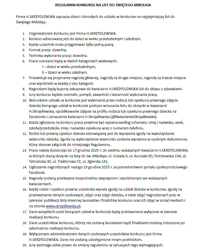 Każdy chętny może wziąć udział w konkursie świątecznym organizowanym przez sieć kwiaciarni H.SKRZYDLEWSKA. Jest to druga edycja naszej zabawy, a do zdobycia są cenne nagrody: kupony zakupowe do kwiaciarni lub sklepu z zabawkami Wybierają nagrodzeni!